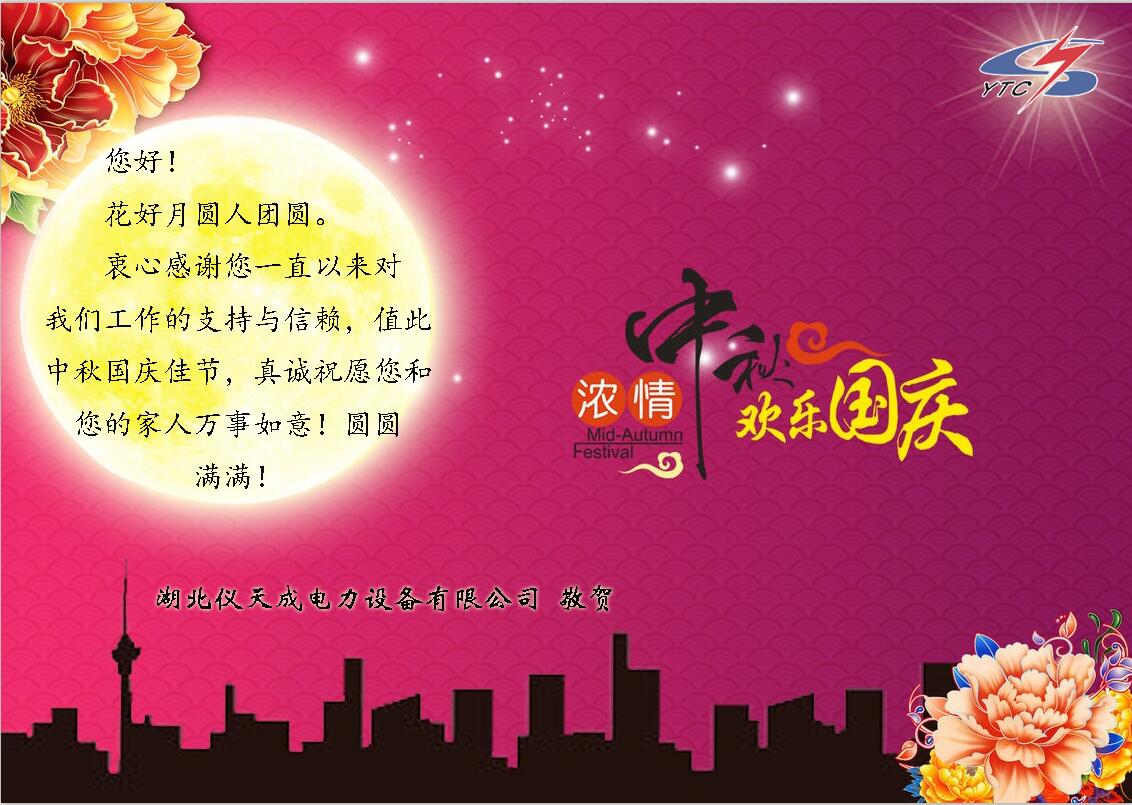 在這舉國(guó)歡慶的時(shí)刻,湖北儀天成電力設(shè)備有限公司衷心的祝愿祝所有的員工,所有的新老客戶,國(guó)慶節(jié)以及中秋節(jié)快樂!