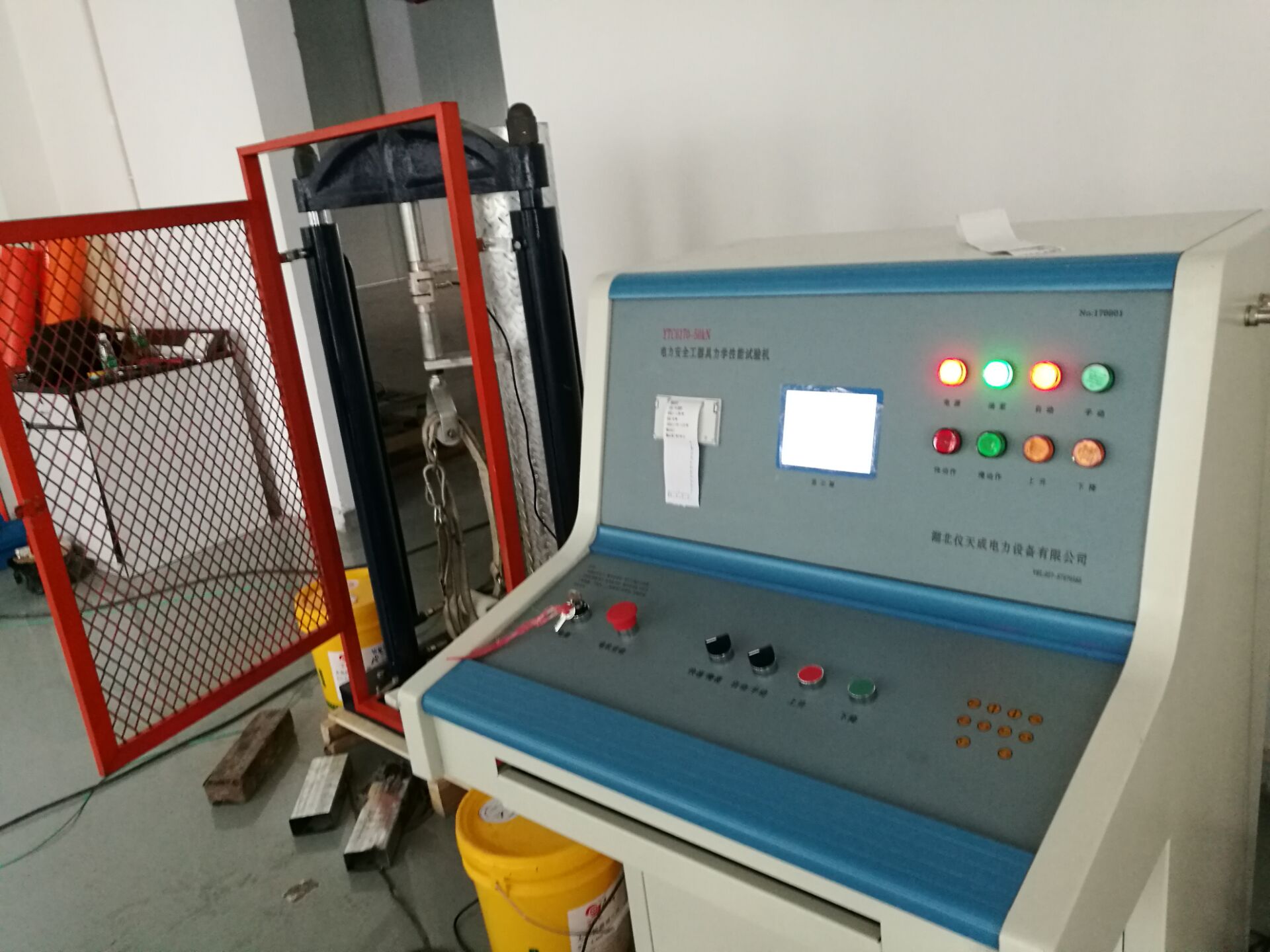 此次培訓(xùn)的重點設(shè)備是YTC6170電力安全工具器具力學(xué)性能測試機(jī),我公司研制的電子測力機(jī)(電力安全工器具力學(xué)性能試驗機(jī)),符合國家電力公司《電力安全工器具預(yù)防性試驗規(guī)程》要求,按《規(guī)程》完成各種預(yù)防性力學(xué)性能試驗。本機(jī)由測試顯示和加力設(shè)備兩部分組成(如需測安全帽配安全帽試驗臺) 測試顯示部分由拉壓力傳感器、控制鍵盤、液晶顯示屏、微型打印機(jī)、手動按扭等組成。鍵盤使用薄膜輕觸鍵,使用手感好,液晶顯示為中文菜單式,操作人員可根據(jù)被試對象選擇相應(yīng)名稱菜單,當(dāng)需要對測試結(jié)果打印時,可打印測試報告,便于備案檢查。本機(jī)設(shè)置兩個傳感器接口,傳感器3KN、100KN傳感器為測試安全工具之用。安全帽測試為測試安全帽專用。兩只傳感器既可單獨使用,也可同時使用。能滿足不同使用場所環(huán)境的要求和工作要求,性能穩(wěn)定,測試結(jié)果準(zhǔn)確。