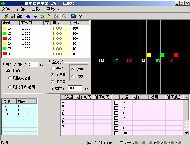 直流試驗(yàn)?zāi)K提供專門的直流電壓和電流輸出,主要是為了滿足做直流電壓繼電器、時(shí)間繼電器以及中間繼電器等試驗(yàn)的要求。直流模塊的主界面如圖所示: