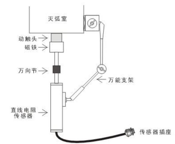 200mm、300mm用于SF6開關(guān)行程,速度的測量,此兩種傳感器為非標(biāo)準(zhǔn)配置。以某型號真空開關(guān)為例,如下圖。直線電阻傳感器在安裝時,要保證傳感器運動軸能夠直線運動,用磁性萬能支架固定好傳感器。對于SF6開關(guān)、油開關(guān),方法類似。