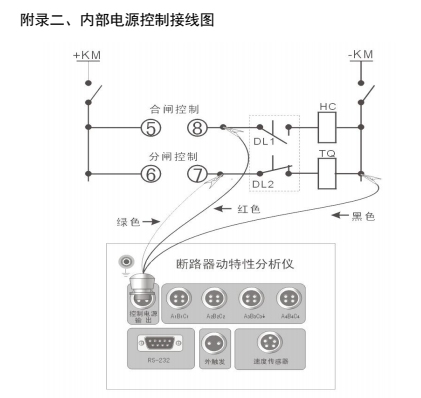 ①分合閘控制電源由儀器內(nèi)部提供時,斷開被測開關控制箱內(nèi)的控制電源(通常是將控制箱內(nèi)控制電源與控制母線相連的保險撥掉),但不能切斷開關機構的儲能電源,然后再按附錄二《內(nèi)部電源控制接線圖》接線。