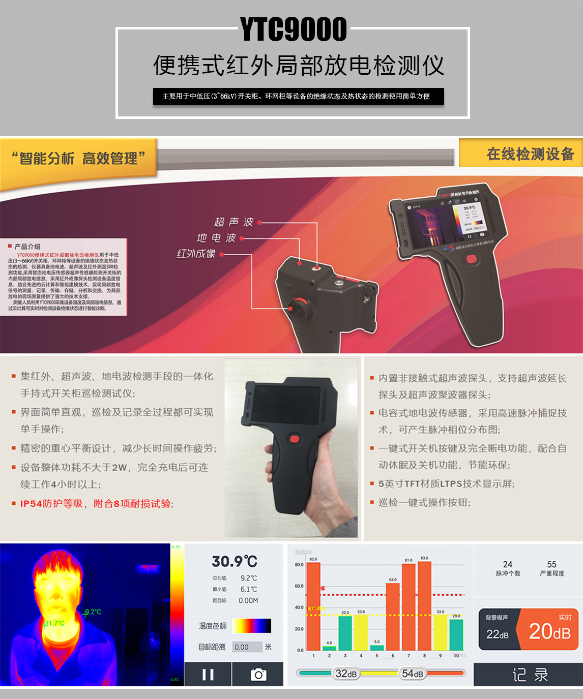 我司研發(fā)的YTC9000便攜式紅外局部放電檢測(cè)儀主要用于中低壓(3~66kV)開(kāi)關(guān)柜、環(huán)網(wǎng)柜等設(shè)備的絕緣狀態(tài)及熱狀態(tài)的檢測(cè),具備地電波、超聲波及紅外成像3種檢測(cè)手段智能評(píng)價(jià)局部放電狀態(tài), 顯示紅綠燈報(bào)警、支持單機(jī)、聯(lián)網(wǎng) 兩種工作模式,使用簡(jiǎn)單方便功能強(qiáng)大。