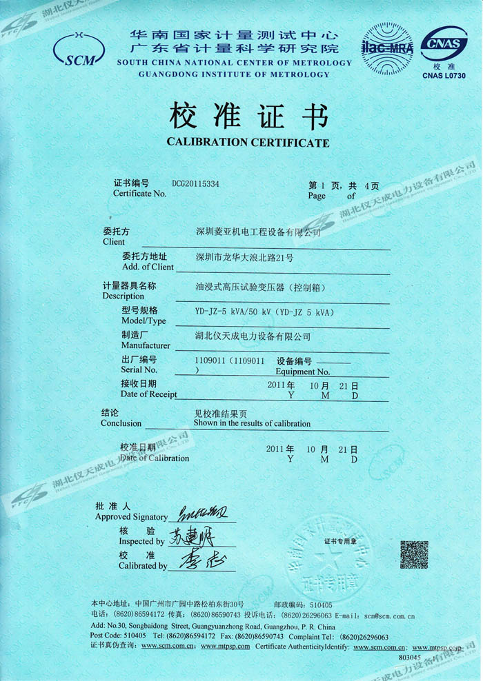 轉(zhuǎn)載:"YD-JZ-5kVA/50kV油浸式高壓試驗變壓器的資質(zhì)證書" 請注明來源于儀天成電力。 更多技術問題請致電儀天成電力客戶服務:027-87876585,技術部專線:027-87876585,在線客服:719388481