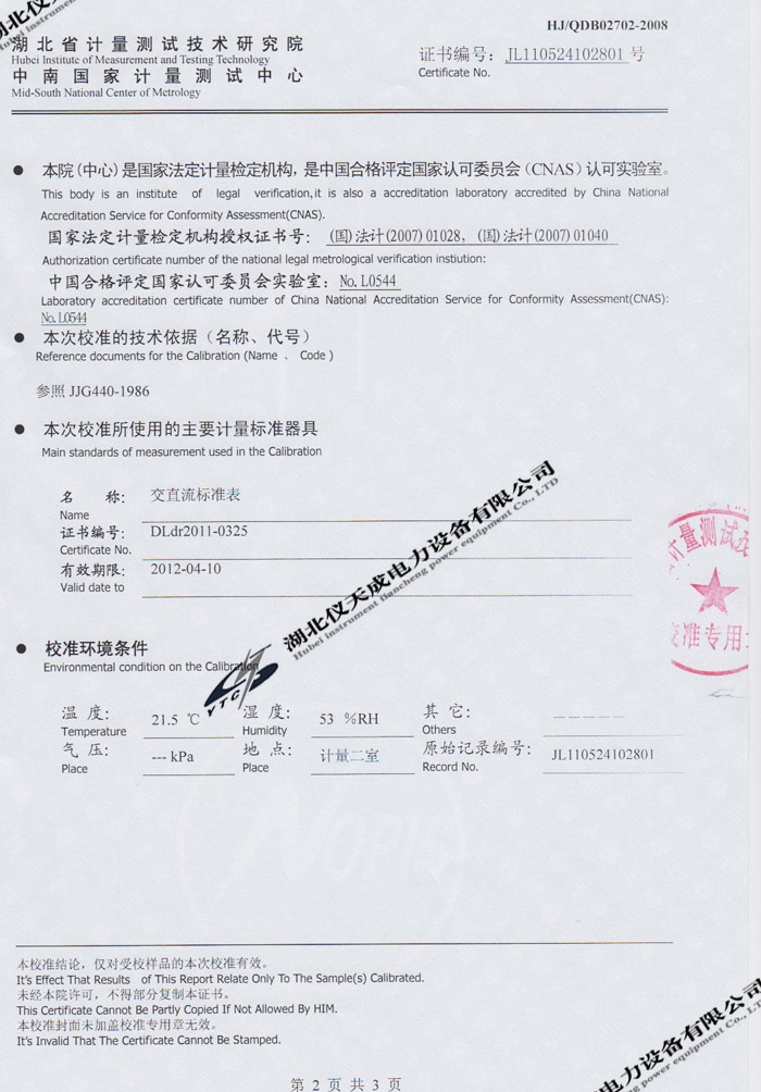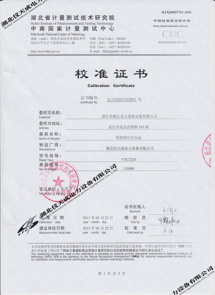 轉(zhuǎn)載:"YTC2220數(shù)字雙鉗相位伏安表的資質(zhì)證書(shū)" 請(qǐng)注明來(lái)源于儀天成電力。 更多技術(shù)問(wèn)題請(qǐng)致電儀天成電力客戶(hù)服務(wù):027-87876585,技術(shù)部專(zhuān)線(xiàn):027-87876585,在線(xiàn)客服:719388481