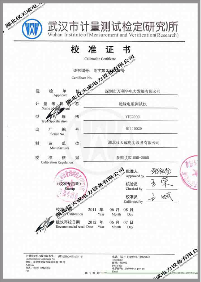 轉(zhuǎn)載:"YTC2000智能雙顯絕緣電阻測(cè)試儀鑒定證書(shū)" 請(qǐng)注明來(lái)源于儀天成電力。 更多技術(shù)問(wèn)題請(qǐng)致電儀天成電力客戶(hù)服務(wù):027-87876585,技術(shù)部專(zhuān)線:027-87876585,在線客服: